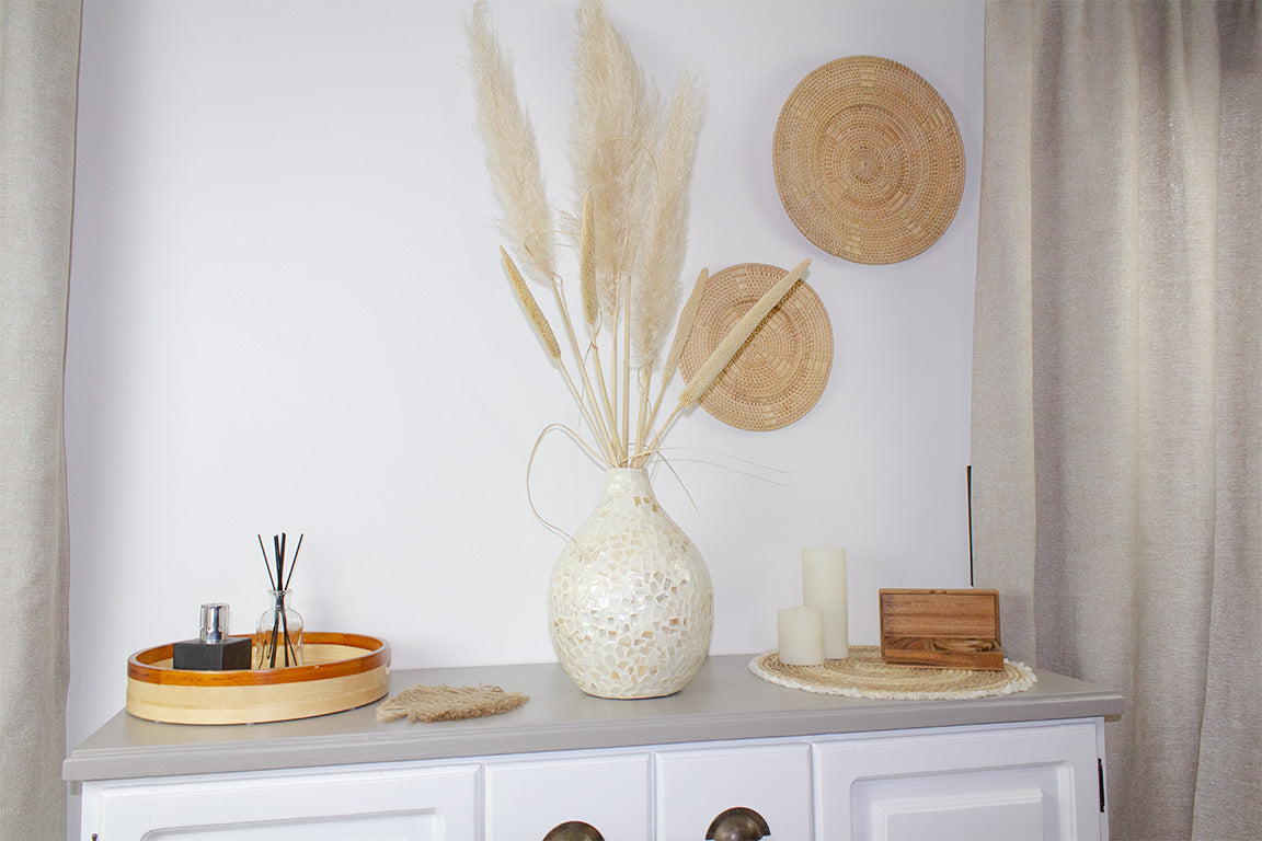 Transformez votre espace avec notre ensemble décoratif élégant ! Nos assiettes murales apportent une touche artistique unique à vos murs, tandis que notre beau vase est parfait pour mettre en valeur des fleurs séchées, ajoutant une note de sophistication. Complétez le tout avec un petit tapis en guise de napperon pour une finition parfaite. Cet assortiment crée un accord harmonieux qui personnalise votre intérieur et impressionne vos invités. Idéal pour un décor raffiné et accueillant qui reflète votre style personnel !