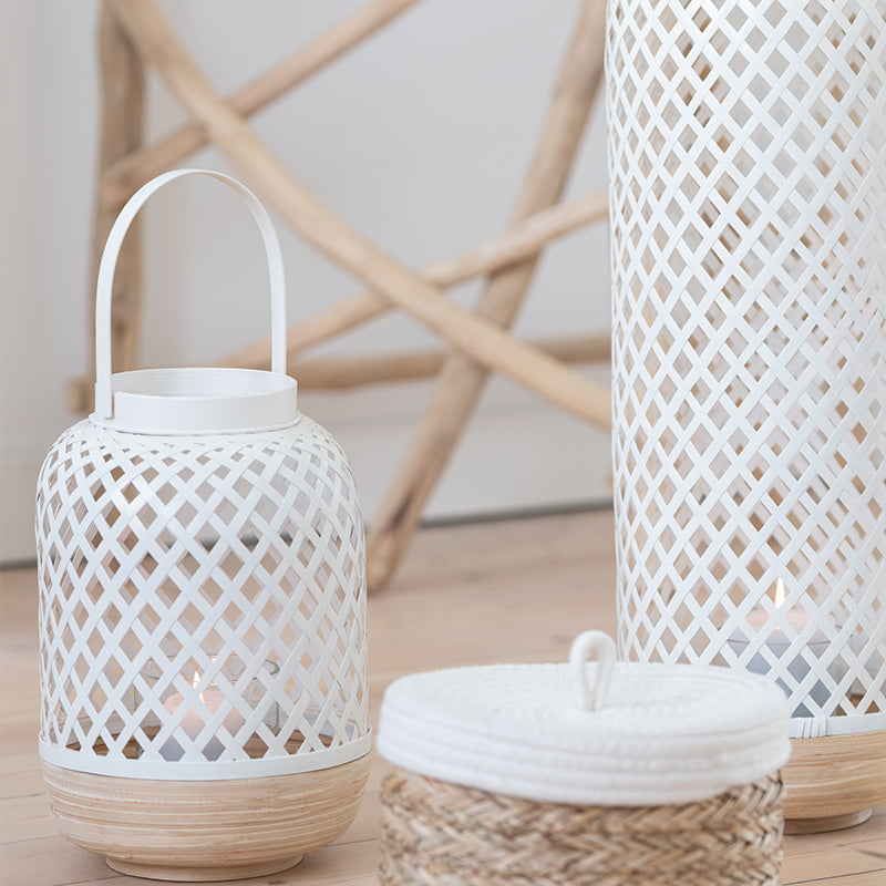 La gamme des lanternes Evi en bambou, disponible en blanc et naturel et en deux tailles, se distingue par sa finesse et sa capacité à créer une ambiance chaleureuse. Le support en verre au centre permet d'intégrer une vraie bougie en toute sécurité ou une bougie LED pour plus de longévité. Parfaites pour illuminer votre intérieur avec élégance, ces lanternes combinent style et fonctionnalité, offrant une touche naturelle et raffinée à n'importe quelle pièce.