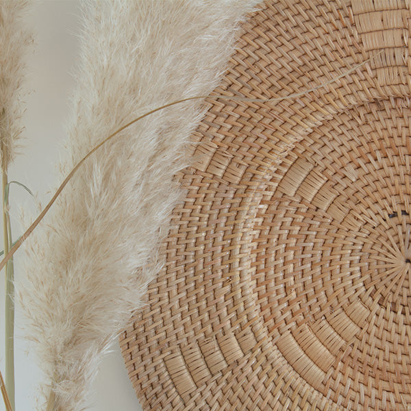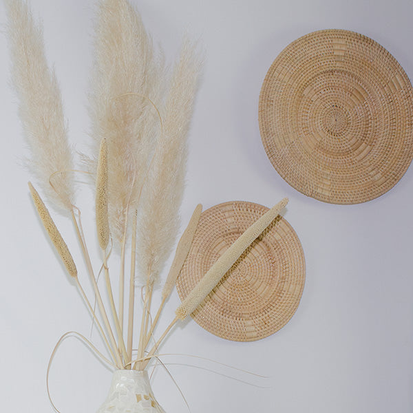 Embellissez votre espace avec cette décoration murale artisanale en rotin tissé, créée par des artisans indonésiens. Disponible en deux tailles, elle s'accroche facilement et ajoute une touche tribale et bohème à votre intérieur.