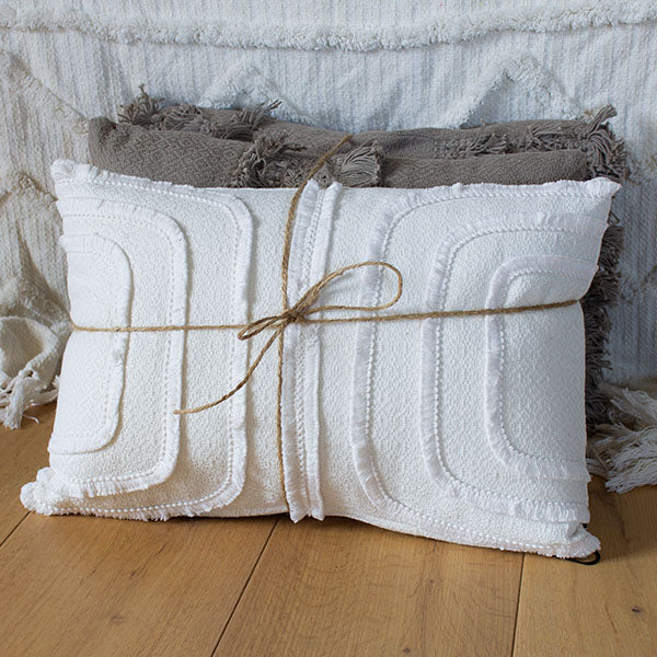 Ensemble composé des coussins modèle Arc blanc et Floche coloris taupe
