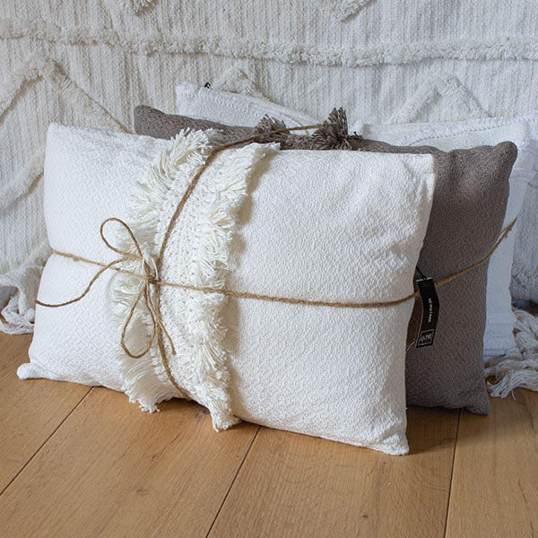 Ensemble composé des coussins modèle Floche coloris taupe et blanc et l'Arc blanc
