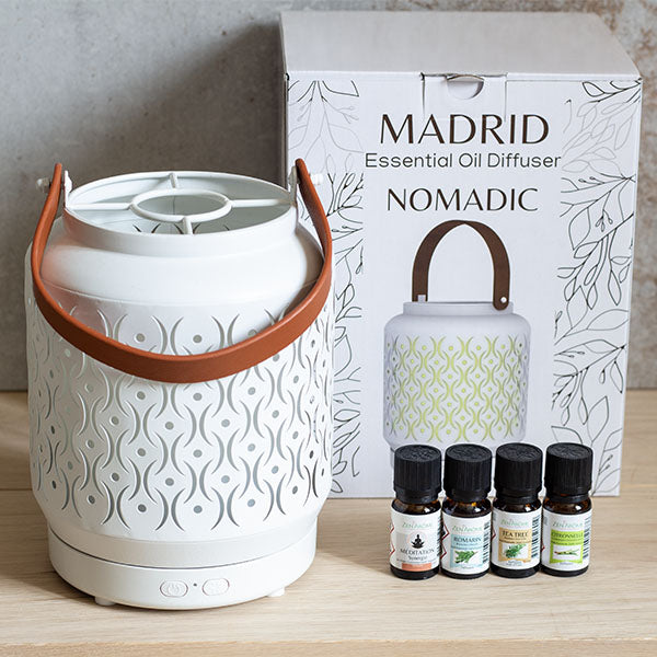 Diffuseur Madrid accompagnés d'huiles essentielles de romarin, arbre à thé, citronnelle et une synergie méditation
