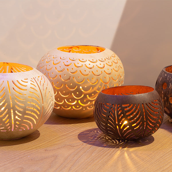 Ce photophore en noix de coco avec motif de feuille ajouré est l'ajout parfait pour une touche ethnique et élégante à votre décoration intérieure. Avec son coloris crème naturel, il diffuse une lumière douce et crée une ambiance chaleureuse. Idéal seul ou en groupe, il s'intègre parfaitement sur une table basse, une étagère ou comme centre de table. Ce modèle unique en noix de coco ajoute une note de sophistication naturelle, complétant votre décoration avec charme et originalité. Un choix idéal pour ceux qui souhaitent apporter une touche exotique et raffinée à leur intérieur.