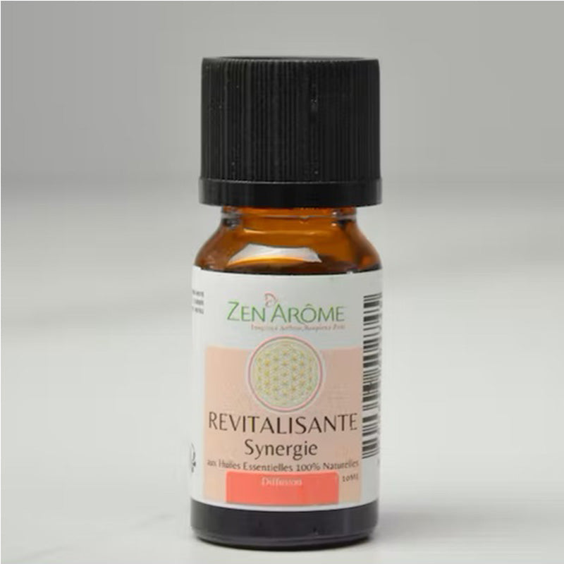 La synergie Revitalisante associe des huiles essentielles telles que citronnelle, eucalyptus, cannelle, carvi, géranium, et clou de girofle. Ces huiles sont connues pour leurs propriétés stimulantes, énergisantes et revitalisantes.