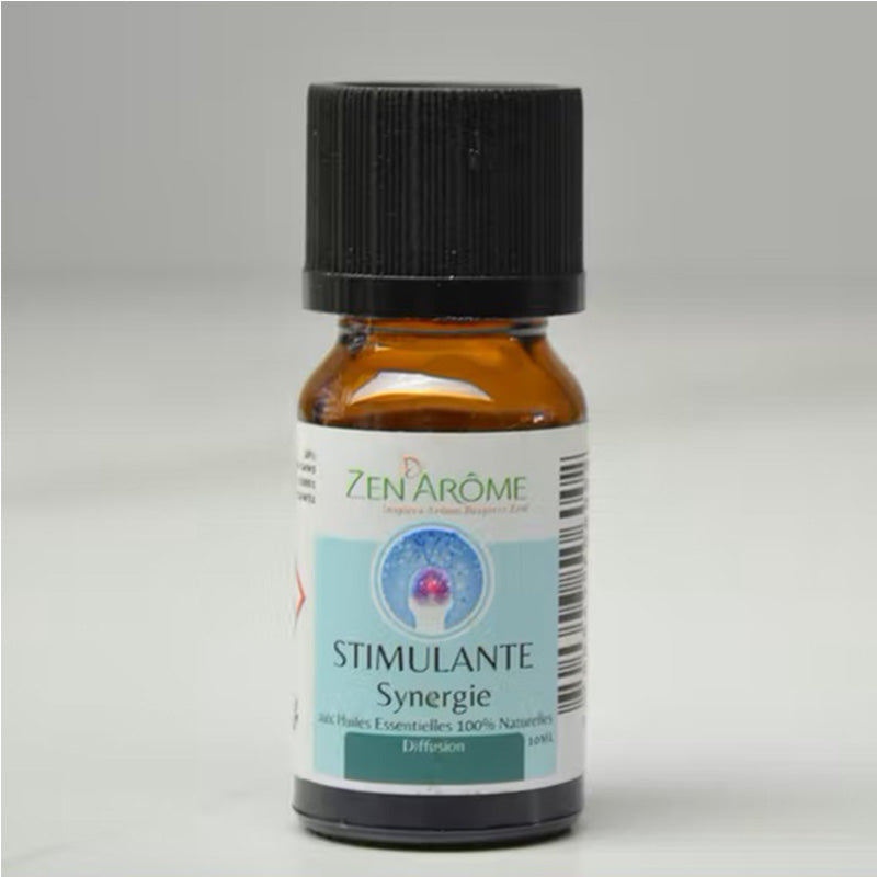 La synergie Stimulante associe des huiles essentielles telles que eucalyptus, menthe poivrée, estragon, carvi, géranium, et orange. Ces huiles sont souvent choisies pour leurs effets vivifiants, énergisants et rafraîchissants.